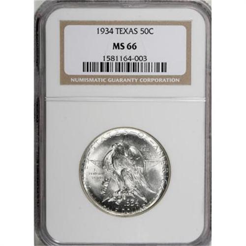 <B>1934 50C Texas MS66 NGC.</B></I> NGC Census: (342/37). PCGS Population (311/38). Mintage: 61,463. Numismedia Wsl. Price for NGC/PCGS coin in MS66: $380. (#9381)<BR><BR><b>Shipping:</b> Coins & Currency (<a target="_blank" href="http://www.heritageauctions.com/common/shipping.php">view shipping information</a>)