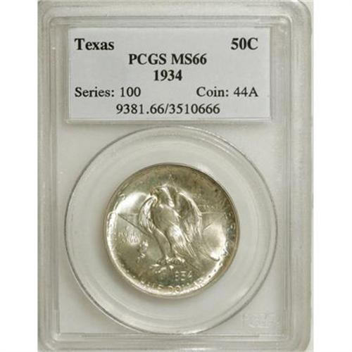 <B>1934 50C Texas MS66 PCGS.</B></I> PCGS Population (298/38). NGC Census: (337/37). Mintage: 61,463. Numismedia Wsl. Price for NGC/PCGS coin in MS66: $380. (#9381)<BR><BR><b>Shipping:</b> Coins & Currency (<a target="_blank" href="http://www.heritageauctions.com/common/shipping.php">view shipping information</a>\)