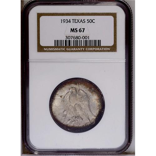 <B>1934<50C> Texas MS67 NGC.</B></I> Fully original with deep russet patina on both sides that circles gray-gold centers. As one would expect from a Superb Gem, contact marks are held at a minimum. <BR><BR><B>Important notice:</B> Heritage usually auctions material at the rate of 200-250 lots per hour. On some occasions eBay Live bid software or the Internet may not be able to keep up with the pace of the auction. We recommend placing a realistic absentee bid now as insurance to avoid disappointment. Occasionally the auctioneer may eliminate or reject an eBay Live bid, and the auctioneer may also reopen a lot after the close of the eBay live bidding (usually because we missed an audience bid), and may reject your bid even if it shows you as the winning bidder. By bidding via eBay Live, you agree that Heritage may award the lot to another bidder at its sole discretion under the circumstances described above or any other reasonable circumstances. Since eBay bids are not shown to us until we open the lot on the floor, we treat those bids just like floor bids. In most cases the floor responds before the eBay bid is presented to us, due to Internet lag time, so for consistency we have made it a policy that floor bids are always considered first over tie eBay live bids. Also please note that all Heritage lots purchased through eBay Live carry a 20% Buyer's Premium. Please make sure you read the Terms and Conditions before you bid. This lot is being auctioned in conjunction with a live floor auction by Heritage Galleries & Auctioneers. All final auction and invoice information will be supplied by Heritage Galleries & Auctioneers, and all other information should be considered preliminary. Lot:5092 <BR><BR><B>Winning Notification and Billing:</B> After the FINAL session in this auction is complete, Heritage will send e-mail and snail mail invoices. This process normally takes several days. All final auction and invoice information will be supplied by Heritage Galleries & Auctioneers, and all other information should be considered preliminary. <BR><BR>This auction will be conducted on a live auction floor and over the Internet through eBay Live. If you choose to place an absentee bid, please take a moment to <font color='#0000ff'><u><a href='http://pages.ebay.com/liveauctions/help/before/laabsentee.html'>learn how eBay Live absentee bidding works</a></u></font><font color='#000000'>