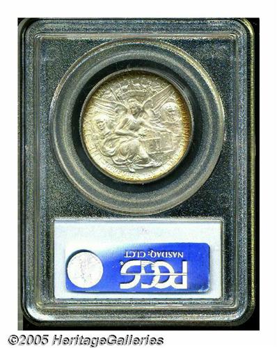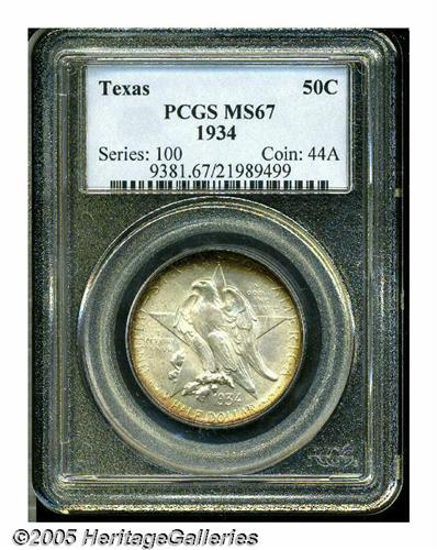 <B>1934<50C> Texas MS67 PCGS.</B></I> Sharply struck and highly lustrous, with seemingly pristine surfaces and beautiful magenta, lime-green, and burnt-orange toning near the obverse and reverse peripheries. An outstanding, visually pleasing Superb Gem. Population: 26 in 67, 1 finer (5/05).