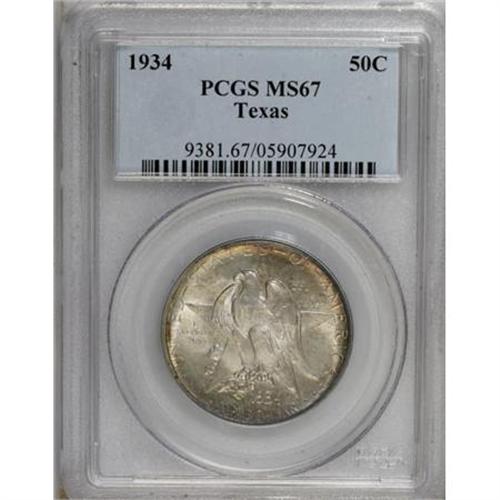 <B>1934 50C Texas MS67 PCGS.</B></I> Original autumn-brown and powder-blue endow this satiny and solidly struck representative. The left (facing) arm of the Winged Victory is shiny from its die ejection.<BR><BR><b>Shipping:</b> Coins & Currency (<a target="_blank" href="http://www.heritageauctions.com/common/shipping.php">view shipping information</a>)