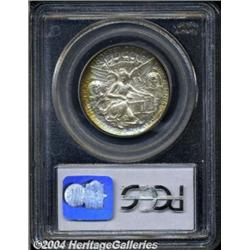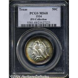 <B>1934<50C> Texas MS68 PCGS.</B></I> Gorgeous ruby-red, honey-gold, forest-green, and ice-blue colors hug the borders and provide outstanding eye appeal. Potent cartwheel luster sweeps across this unmarked and crisply struck Superb Gem. The reverse of the Texas Half manages to unify many separate motifs, which include the Alamo, the six flags over Texas, portraits of Austin and Houston, and a Winged Victory that represents independence from Mexico. The single finest certified example of this introductory issue, since there are no other pieces certified above the MS67 level by either NGC or PCGS. Those who seek the highest attainable quality need look no further.<BR><I>Ex: New York Signature Sale (Heritage, 7/02), lot 5106, which realized $13,800.</B></I><BR><I>From the JFS Collection, the #1 All-Time PCGS Registry Set.</B></I> <BR><BR><B>Important notice:</B> Heritage usually auctions material at the rate of 200-250 lots per hour. On some occasions eBay Live bid software or the Internet may not be able to keep up with the pace of the auction. We recommend placing a realistic absentee bid now as insurance to avoid disappointment. Occasionally the auctioneer may eliminate or reject an eBay Live bid, and the auctioneer may also reopen a lot after the close of the eBay live bidding (usually because we missed an audience bid), and may reject your bid even if it shows you as the winning bidder. By bidding via eBay Live, you agree that Heritage may award the lot to another bidder at its sole discretion under the circumstances described above or any other reasonable circumstances. Since eBay bids are not shown to us until we open the lot on the floor, we treat those bids just like floor bids. In most cases the floor responds before the eBay bid is presented to us, due to Internet lag time, so for consistency we have made it a policy that floor bids are always considered first over tie eBay live bids. Also please note that all Heritage lots purchased through eBay Live carry a 20% Buyer's Premium. Please make sure you read the Terms and Conditions before you bid. </span></font></tr></table></td></tr></table>