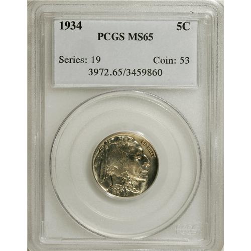 <B>1934 5C MS65 PCGS.</B></I> PCGS Population (440/160). NGC Census: (498/144). Mintage: 20,213,004. Numismedia Wsl. Price for NGC/PCGS coin in MS65: $320. (#3972)<BR><BR><b>Shipping:</b> Coins & Currency (<a target="_blank" href="http://www.heritageauctions.com/common/shipping.php">view shipping information</a>)