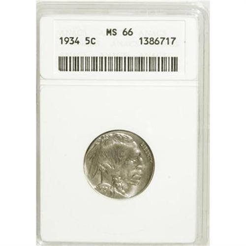<B>1934 5C MS66 ANACS.</B></I> Excellent definition overall with lovely luster and delicate ice-blue patina. Even under magnification, this P-mint Premium Gem shows only a handful of minor flaws.<BR><BR><B>Coin Engraver:</B> James E. Fraser<BR><BR><b>Shipping:</b> Coins & Currency (<a target="_blank" href="http://www.heritageauctions.com/common/shipping.php">view shipping information</a>)