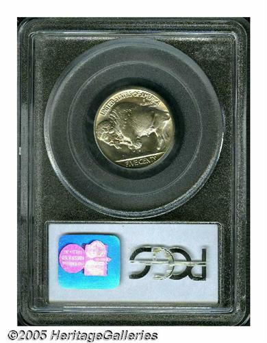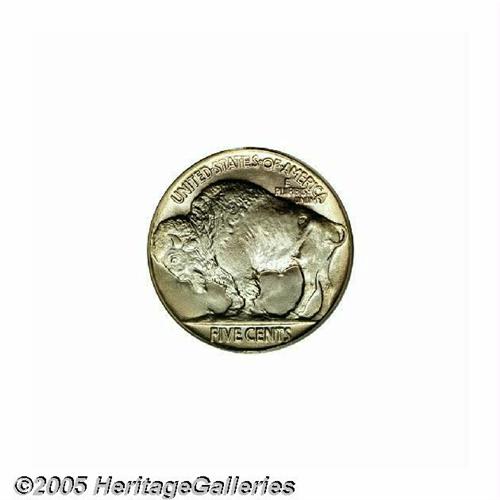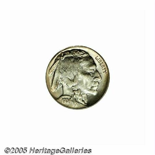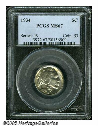 <B>1934<5C> MS67 PCGS.</B></I> This spectacular Buffalo nickel has impeccable luster with bold definition of strike. A beautiful encirclement of just a hint of champagne and silver-rose patina surrounds the design at the rims. Population: 17 in 67, 0 finer (6/05).