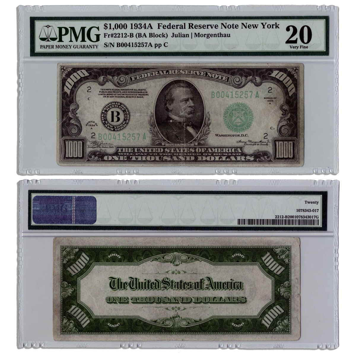 $1,000 Federal Reserve Note -- Series 1934A -- Graded PMG 20