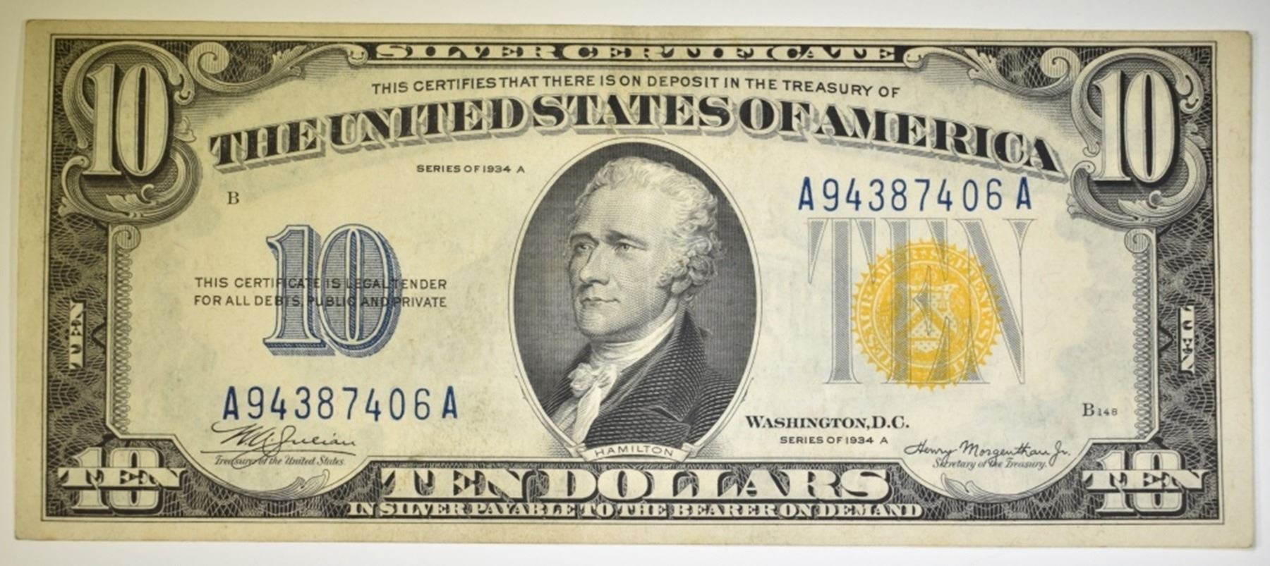 1934-A $10 N. AFRICA SILVER CERTIFICATE, AU