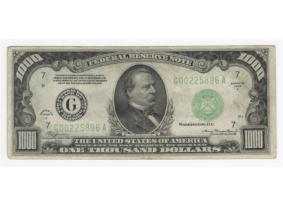 One 1934-A $1000 Federal Reserve Bank Note Chicago.