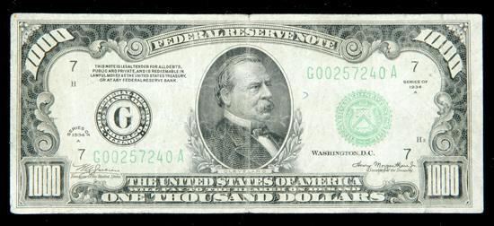 1934-A, $1000 Federal Reserve Note. . Fr-2212-G. Split and repaired. Good to Very Good.