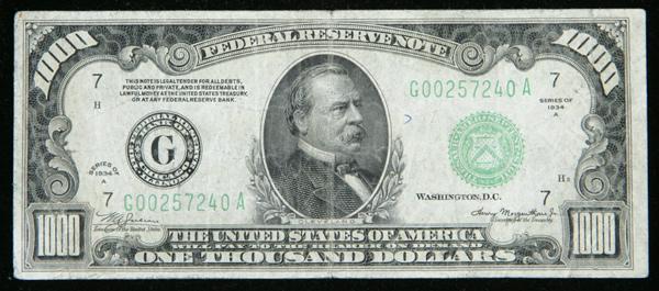 1934-A, $1000 Federal Reserve Note. . Fr-2212-G. Split and repaired. Good to Very Good.
