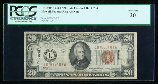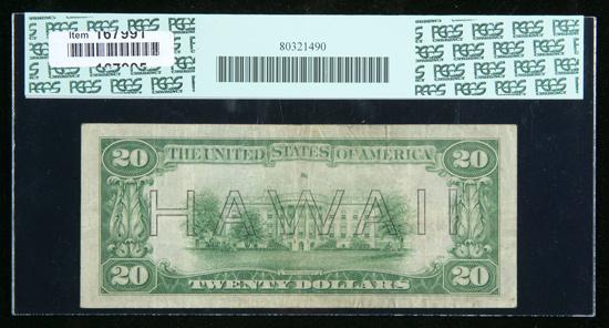 1934-A, $20 World War II Emergency Note. Hawaii. Late Finished Back Plate 204. PCGS Currency Very Fine 20. . Fr-2305. A nice, solid mid-grade example of this scarcer variety with the late finished back plate #204. It catalogs for $150 in the most recent Schwartz & Lindquist small size reference.