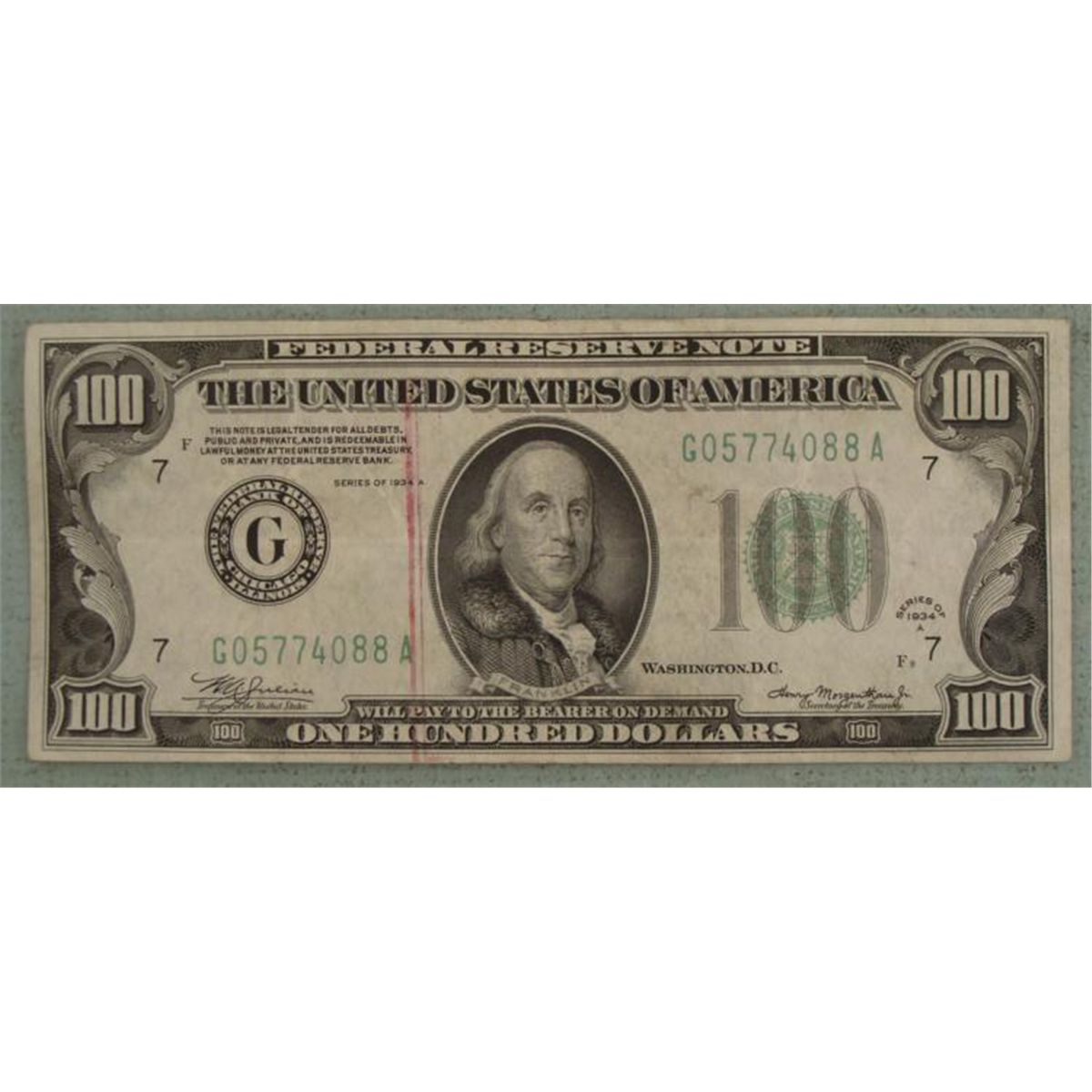$100 1934 A F9 US Note * Mint mark: G (Chicago) Details: With red bank stamp Condition: Nice