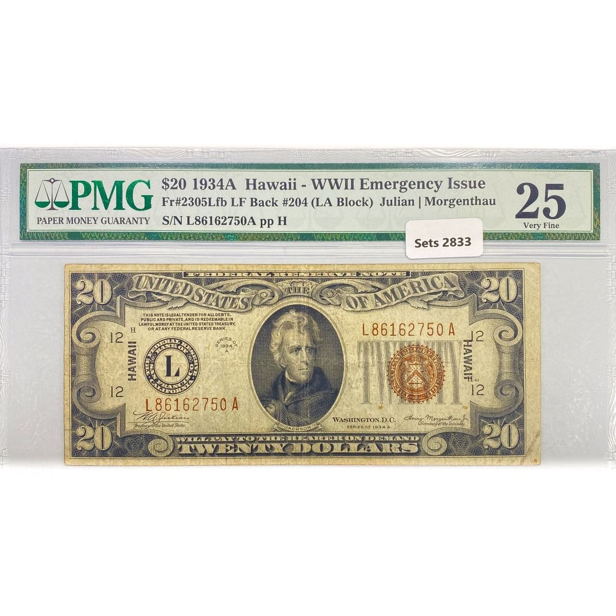 1934 A Hawaii WW2 $20 Fed Reserve Note PMG VF 25