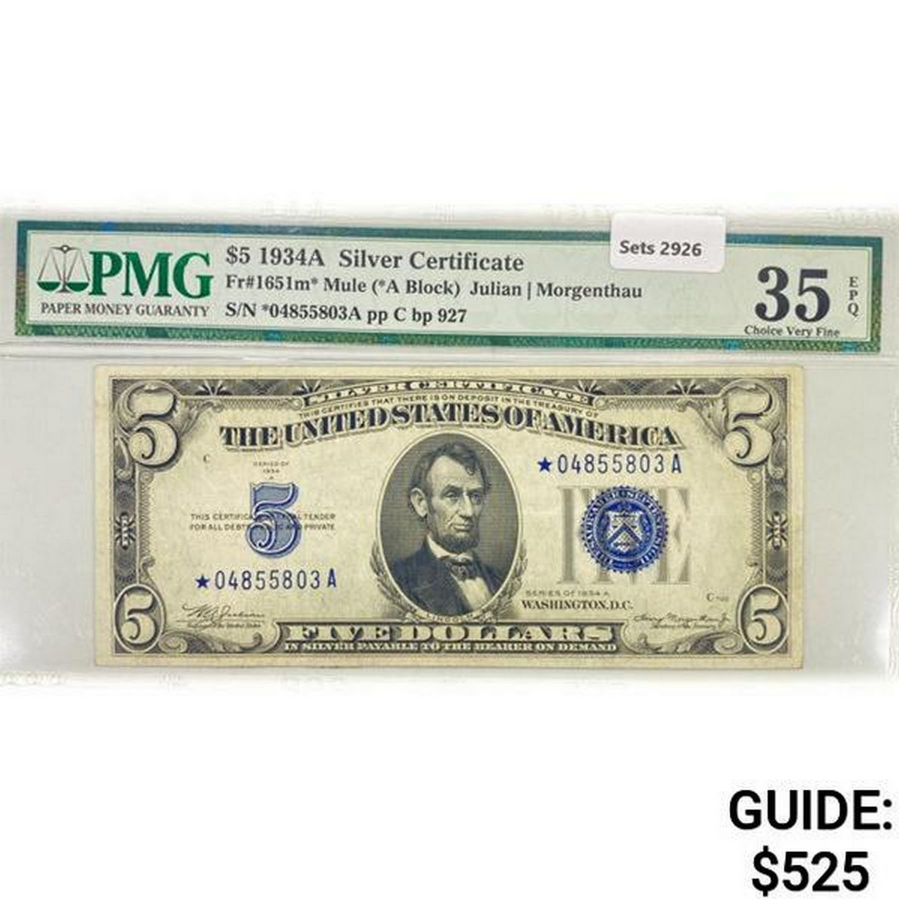 1934 A Star $5 Silver Cert. PMG Ch VF 35