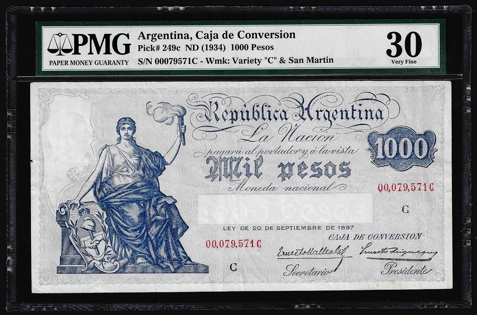 1934 Argentina 1000 Pesos Caja de Conversion Bank Note PMG Very Fine 30