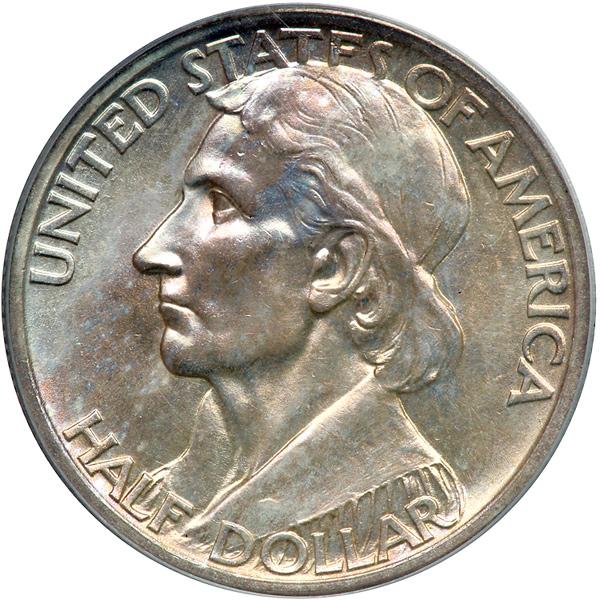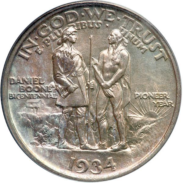 1934 Boone Half Dollar. PCGS graded MS-64. Attractive multi-colored toning graces both sides (PCGS # 9257) .