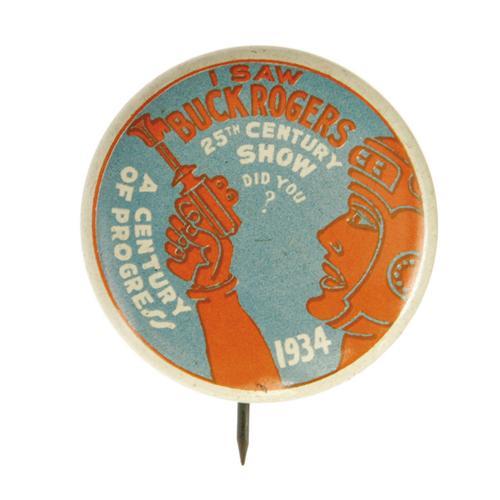 <B>Gorgeous Chicago's 1934 Century of Progress Exposition Buck Rogers Button.</B></I> This exciting litho pinback in blue and orange tones reads "I Saw Buck Rogers 25th Century Show Did You?". Hollywood's original intergalactic adventurer is shown brandishing a ray gun. The button's back carries a decoy and indicates manufacture by the Greenduck Co., Chicago. A scarce button by any standard, this specimen is a condition rarity with lovely surfaces and vibrant colors. Very choice, virtually mint condition. 1 1/8" diameter. <BR><BR><B>Important no