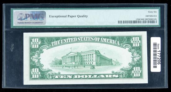 1934-C, $10 Silver Certificate. Star Note. PMG Gem Uncirculated 66EPQ. . Fr-1704*. A beautifully margined and well centered Star Note that appears to have made the assigned grade with no problem at all.