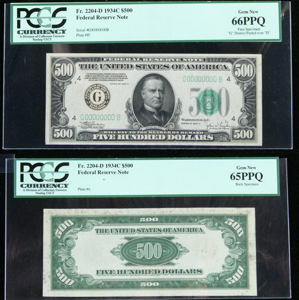1934-C, $500 Federal Reserve Note. FACE and BACK SPECIMENS. . Fr-2204-D. The Face Specimen is PCGS graded Gem New 66PPQ. "G" District Pasted over "D", Plate #15. Serial #G00000000B. The Back Specimen is PCGS graded Gem New 65PPQ. Plate #6.