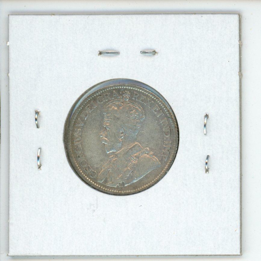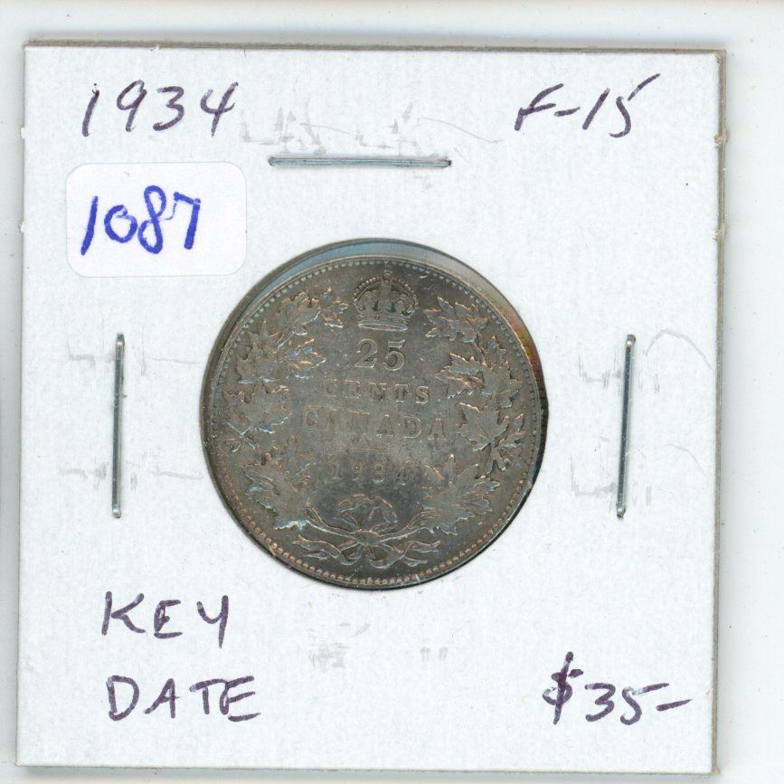 1934 Canadian Silver 25 Cents. Key Date. Mintage of 384,350. F-15.