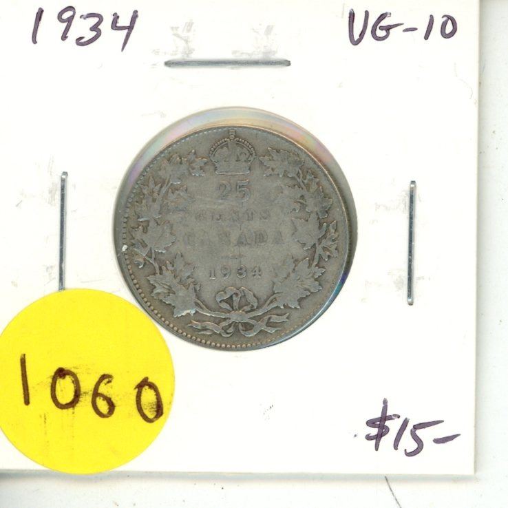1934 Canadian Silver 25 Cents. Key Date. VG-10.