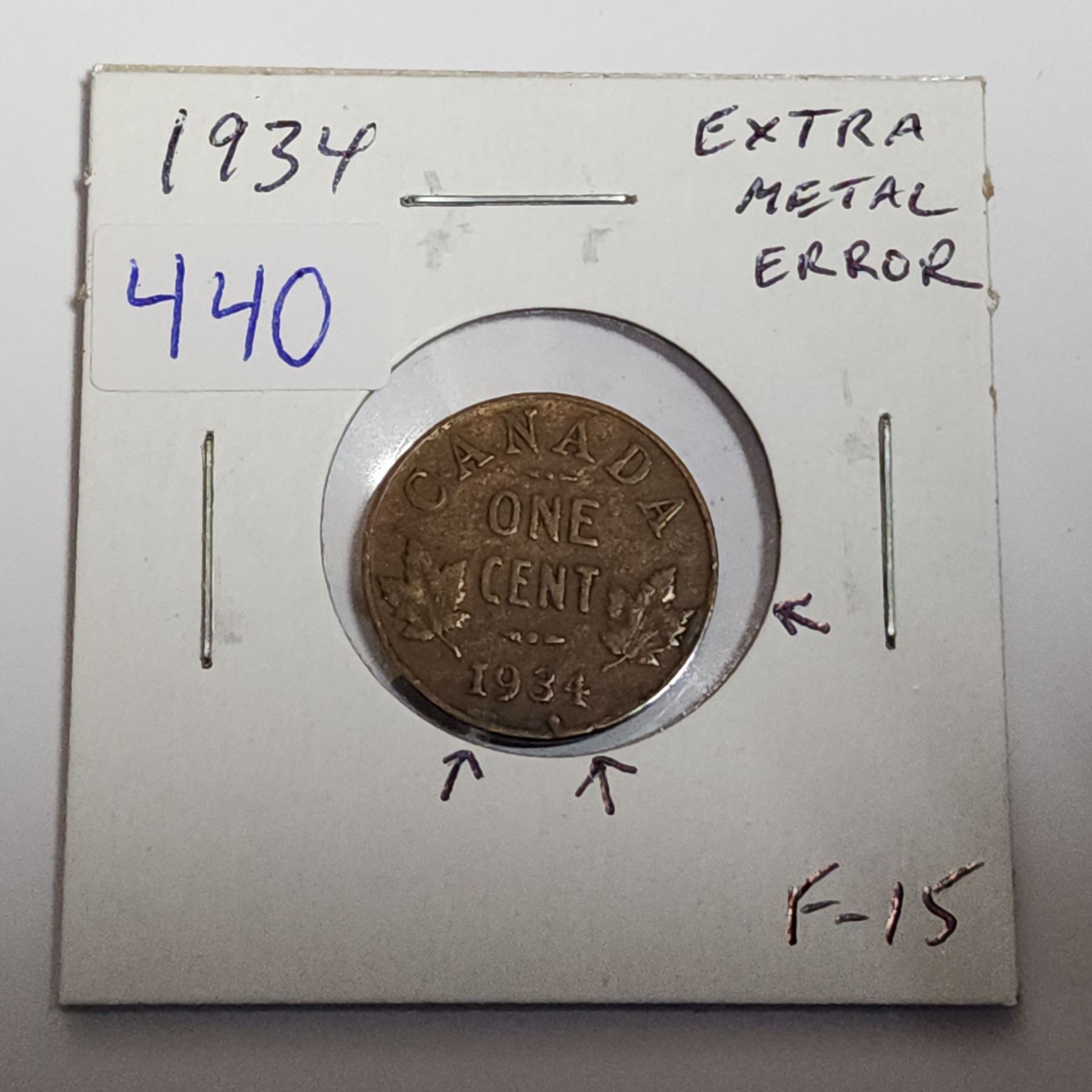 1934 Cent Error. Coin has extra metal in 3 places on the Reverse. F-15. Scarce.