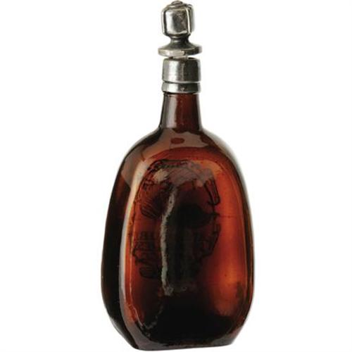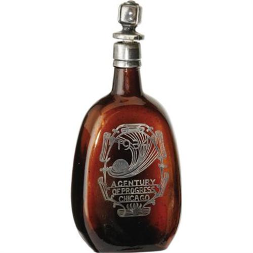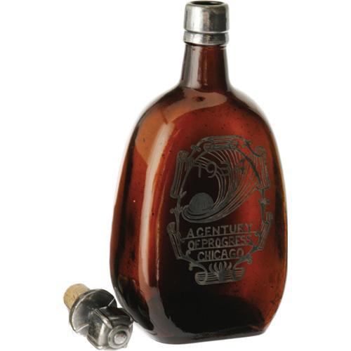 <B>1934 Chicago Century of Progress Bottle.</B></I> With Prohibition having recently been repealed, souvenir vendors were again able to sell liquor bottles such as this example. A substantial piece of dark brown glass with one side having "1934 A CENTURY OF PROGRESS CHICAGO" set against a scrolled and foliate border. The bottle's lip and corked stopper are of sterling silver. 10" high. Excellent condition.
