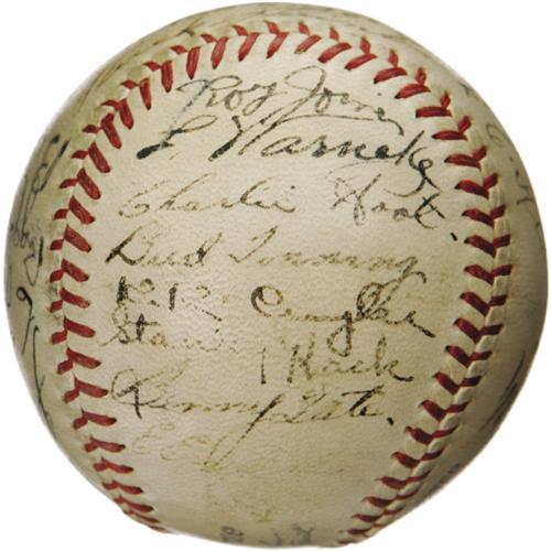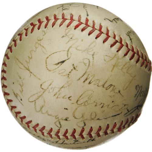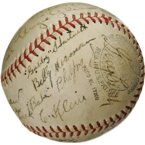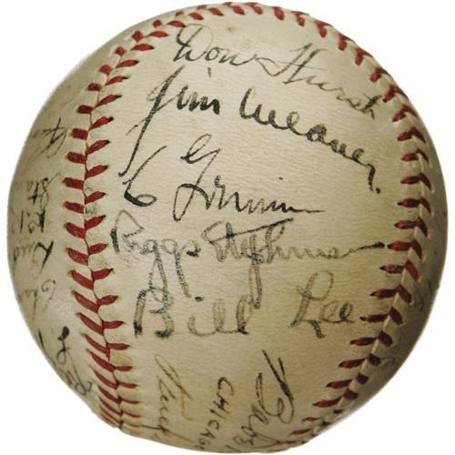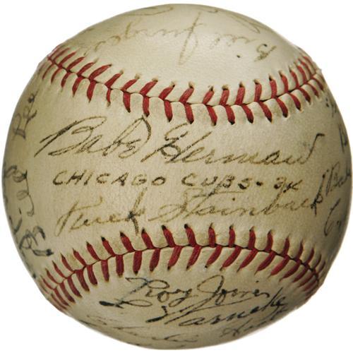 <B>1934 Chicago Cubs Team Signed Baseball.</B></I> Tremendous Hall of Fame talent makes this ONL (Heydler) ball a winner even if the club itself could only muster a third place showing this season. Twenty-five black fountain pen autographs include Cuyler, Hartnett, Herman and the tough Chuck Klein, whose early death in 1958, twenty-two years before his Hall of Fame induction, makes him a challenge for collectors. Among the balance of autographs are Grimm, Galan, Warneke and Charlie Root, two years removed from his surrendering of the Babe's "Called Shot" in the 1932 Series. Autograph quality averages a fairly consistent 8/10, with only a single, lesser name causing any amount of eye strain. A jewel from the dugout at Wrigley. <I>LOA from PSA/DNA. LOA from James Spence Authentication.</B></I><BR><BR><b>Shipping:</b> Balls, Pucks, etc., Small (<a target="_blank" href="http://www.heritageauctions.com/common/shipping.php">view shipping information</a>)