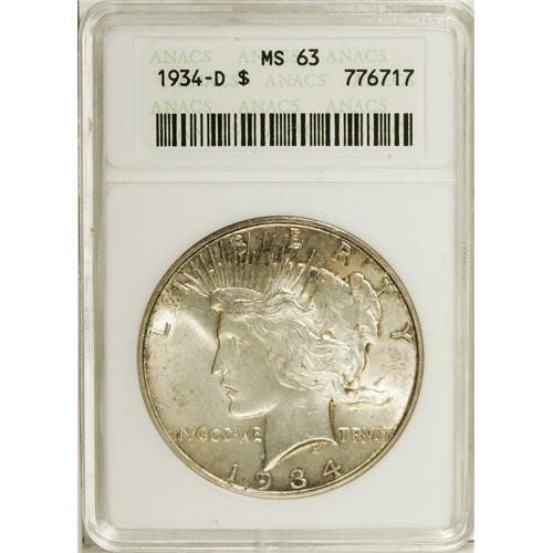 <B>1934-D $1 MS63 ANACS.</B></I> NGC Census: (860/836). PCGS Population (1013/1305). Mintage: 1,569,500. Numismedia Wsl. Price: $384. (#7376)<BR><BR><b>Shipping:</b> Coins & Currency (<a target="_blank" href="http://www.heritageauctions.com/common/shipping.php">view shipping information</a>)