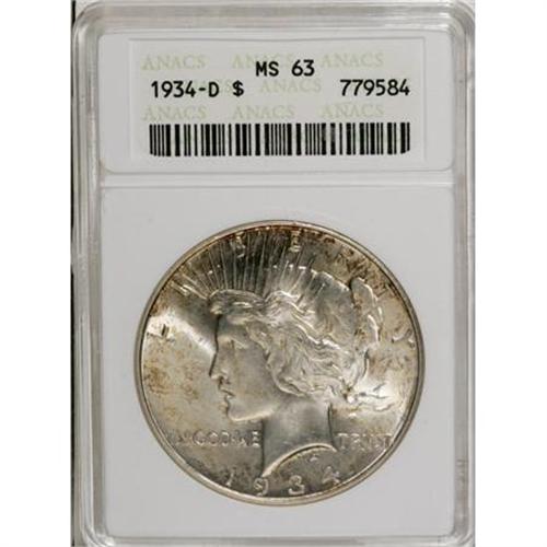 <B>1934-D $1 MS63 ANACS.</B></I> . NGC Census: (942/867). PCGS Population (1109/1431). Mintage: 1,569,500. Numismedia Wsl. Price for NGC/PCGS coin in MS63: $385. (#7376)<BR><BR><B>Coin Engraver:</B> Anthony de Francisci<BR><BR><b>Shipping:</b> Coins & Currency (<a target="_blank" href="http://www.heritageauctions.com/common/shipping.php">view shipping information</a>)