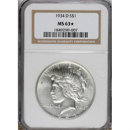 <B>1934-D $1 MS63 <img border='0' src='http://www.heritagecoins.com/images/star.gif' width=10 height=10> NGC.</B></I> NGC Census: (873/844). PCGS Population (1028/1301). Mintage: 1,569,500. Numismedia Wsl. Price for NGC/PCGS coin in MS63: $384. (#7376)<BR><BR><b>Shipping:</b> Coins & Currency (<a target="_blank" href="http://www.heritageauctions.com/common/shipping.php">view shipping information</a>)