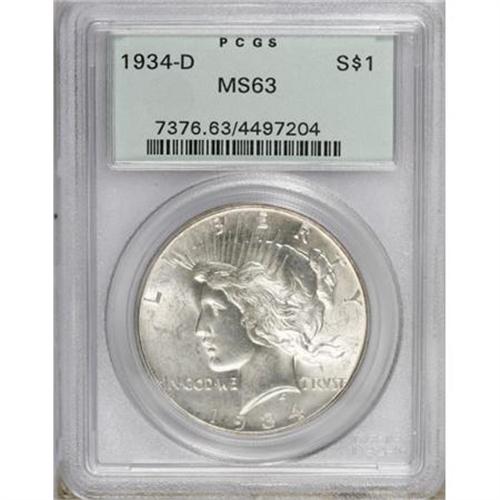 <B>1934-D $1 MS63 PCGS.</B></I> PCGS Population (1096/1411). NGC Census: (941/867). Mintage: 1,569,500. Numismedia Wsl. Price for NGC/PCGS coin in MS63: $380. (#7376)<BR><BR><B>Coin Engraver:</B> Anthony de Francisci<BR><BR><b>Shipping:</b> Coins & Currency (<a target="_blank" href="http://www.heritageauctions.com/common/shipping.php">view shipping information</a>)
