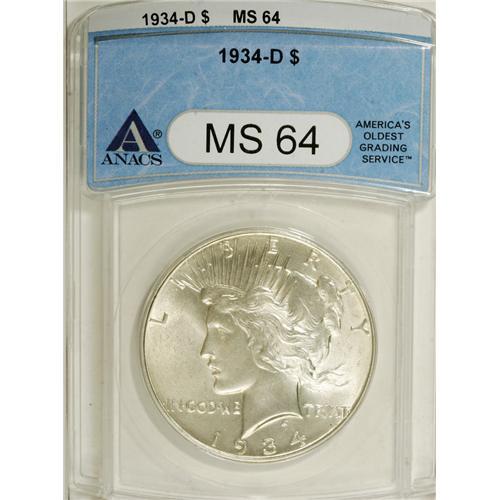 <B>1934-D $1 MS64 ANACS.</B></I> NGC Census: (632/207). PCGS Population (881/422). Mintage: 1,569,500. Numismedia Wsl. Price for NGC/PCGS coin in MS64: $510. (#7376)<BR><BR><b>Shipping:</b> Coins & Currency (<a target="_blank" href="http://www.heritageauctions.com/common/shipping.php">view shipping information</a>)