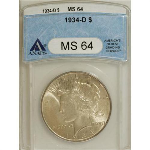 <B>1934-D $1 MS64 ANACS.</B></I> NGC Census: (648/210). PCGS Population (922/435). Mintage: 1,569,500. Numismedia Wsl. Price for NGC/PCGS coin in MS64: $575. (#7376)<BR><BR><B>Coin Engraver:</B> Anthony de Francisci<BR><BR><b>Shipping:</b> Coins & Currency (<a target="_blank" href="http://www.heritageauctions.com/common/shipping.php">view shipping information</a>)
