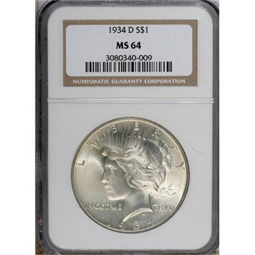<B>1934-D $1 MS64 NGC.</B></I> NGC Census: (651/211). PCGS Population (946/436). Mintage: 1,569,500. Numismedia Wsl. Price for NGC/PCGS coin in MS64: $570. (#7376)<BR><BR><B>Coin Engraver:</B> Anthony de Francisci<BR><BR><b>Shipping:</b> Coins & Currency (<a target="_blank" href="http://www.heritageauctions.com/common/shipping.php">view shipping information</a>)