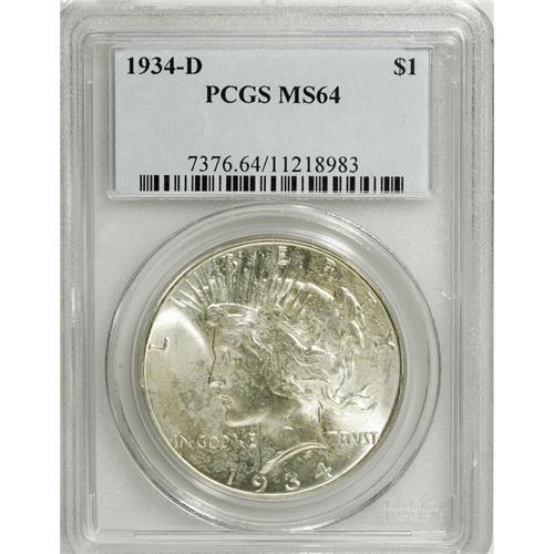 <B>1934-D $1 MS64 PCGS.</B></I> PCGS Population (0/0). NGC Census: (634/207). Mintage: 1,569,500. Numismedia Wsl. Price for NGC/PCGS coin in MS64: $500. (#7376)<BR><BR><b>Shipping:</b> Coins & Currency (<a target="_blank" href="http://www.heritageauctions.com/common/shipping.php">view shipping information</a>)