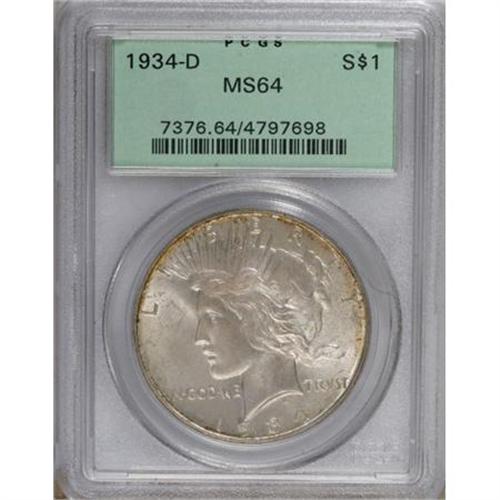 <B>1934-D $1 MS64 PCGS.</B></I> PCGS Population (880/421). NGC Census: (636/208). Mintage: 1,569,500. Numismedia Wsl. Price for NGC/PCGS coin in MS64: $575. (#7376)<BR><BR><b>Shipping:</b> Coins & Currency (<a target="_blank" href="http://www.heritageauctions.com/common/shipping.php">view shipping information</a>)