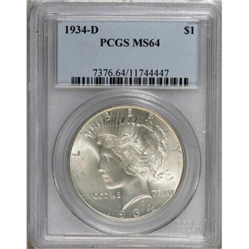 <B>1934-D $1 MS64 PCGS.</B></I> Micro D. A crisply struck and lightly abraded piece with potent luster and an alert strike. Hints of gold and powder-blue toning only add to the eye appeal.<BR><BR><B>Coin Engraver:</B> Anthony de Francisci<BR><BR><b>Shipping:</b> Coins & Currency (<a target="_blank" href="http://www.heritageauctions.com/common/shipping.php">view shipping information</a>)