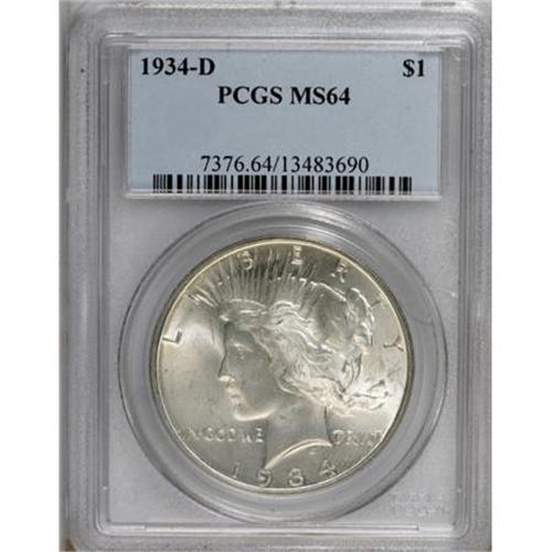 <B>1934-D $1 MS64 PCGS.</B></I> PCGS Population (938/437). NGC Census: (651/211). Mintage: 1,569,500. Numismedia Wsl. Price for NGC/PCGS coin in MS64: $570. (#7376)<BR><BR><B>Coin Engraver:</B> Anthony de Francisci<BR><BR><b>Shipping:</b> Coins & Currency (<a target="_blank" href="http://www.heritageauctions.com/common/shipping.php">view shipping information</a>)