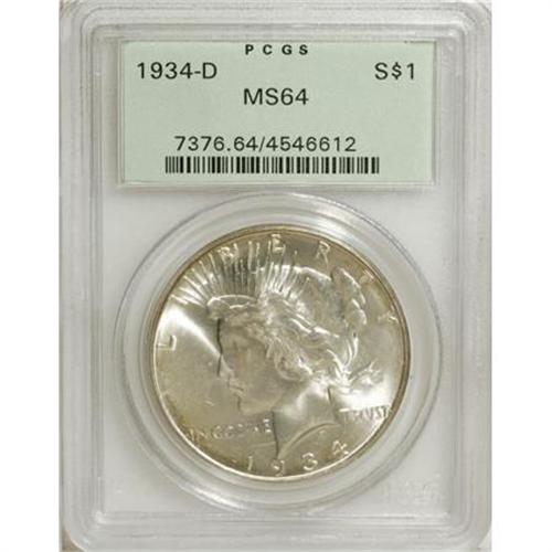 <B>1934-D $1 MS64 PCGS.</B></I> PCGS Population (916/433). NGC Census: (648/210). Mintage: 1,569,500. Numismedia Wsl. Price for NGC/PCGS coin in MS64: $575. (#7376)<BR><BR><B>Coin Engraver:</B> Anthony de Francisci<BR><BR><b>Shipping:</b> Coins & Currency (<a target="_blank" href="http://www.heritageauctions.com/common/shipping.php">view shipping information</a>)