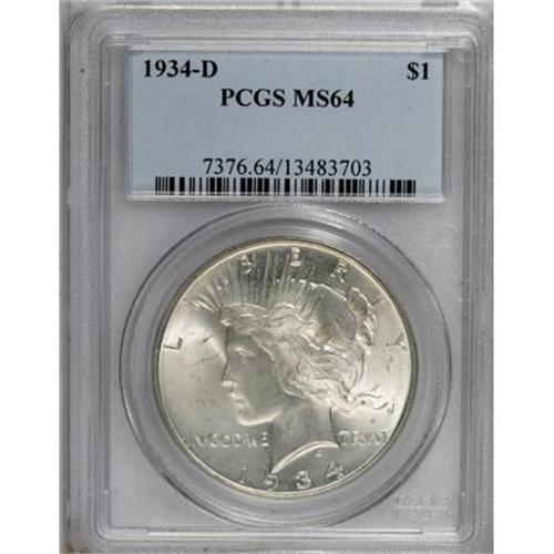 <B>1934-D $1 MS64 PCGS.</B></I> PCGS Population (954/438). NGC Census: (651/211). Mintage: 1,569,500. Numismedia Wsl. Price for NGC/PCGS coin in MS64: $570. (#7376)<BR><BR><B>Coin Engraver:</B> Anthony de Francisci<BR><BR><b>Shipping:</b> Coins & Currency (<a target="_blank" href="http://www.heritageauctions.com/common/shipping.php">view shipping information</a>)