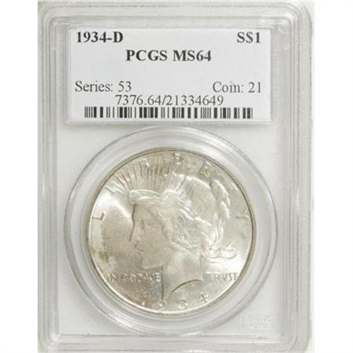 <B>1934-D $1 MS64 PCGS.</B></I> PCGS Population (954/438). NGC Census: (651/211). Mintage: 1,569,500. Numismedia Wsl. Price for NGC/PCGS coin in MS64: $570. (#7376)<BR><BR><B>Coin Engraver:</B> Anthony de Francisci<BR><BR><b>Shipping:</b> Coins & Currency (<a target="_blank" href="http://www.heritageauctions.com/common/shipping.php">view shipping information</a>)