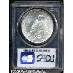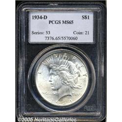 <B>1934-D<img border='0' src='http://www.heritagecoins.com/images/star.gif' width=10 height=10>$1 MS65 PCGS.</B></I> A sharply defined example of this scarce, late-date Peace dollar. Untoned with a few light abrasions scattered about.