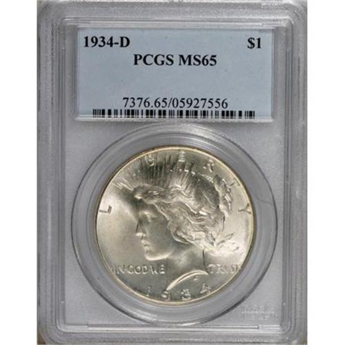 <B>1934-D $1 MS65 PCGS.</B></I> A rare Denver-Mint dollar in Gem. Speckles of gold-tan color run over lustrous surfaces. Sharply struck, and no significant marks.<BR><BR><b>Shipping:</b> Coins & Currency (<a target="_blank" href="http://www.heritageauctions.com/common/shipping.php">view shipping information</a>)