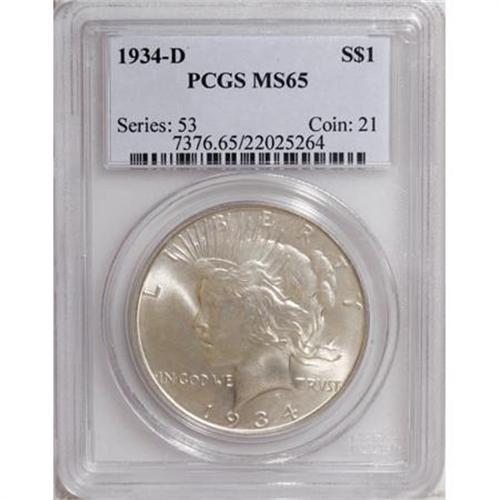 <B>1934-D $1 MS65 PCGS.</B></I> Just a light wash of golden patina covers the otherwise silver surfaces. This boldly struck piece offers premium appeal and a relatively untroubled appearance. <B><BR></B></I><I>From The Arnold & Harriet Collection.</B></I><BR><BR><B>Coin Engraver:</B> Anthony de Francisci<BR><BR><b>Shipping:</b> Coins & Currency (<a target="_blank" href="http://www.heritageauctions.com/common/shipping.php">view shipping information</a>\)