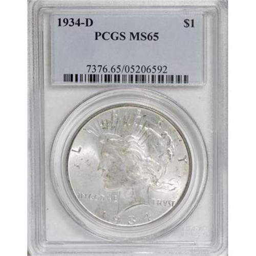 <B>1934-D $1 MS65 PCGS.</B></I> Micro D. Tan freckles grace this shimmering and lovely Gem. A well struck and attractively preserved example of this popular lower mintage issue. The final Denver issue for thirty years.<BR><BR><B>Coin Engraver:</B> Anthony de Francisci<BR><BR><b>Shipping:</b> Coins & Currency (<a target="_blank" href="http://www.heritageauctions.com/common/shipping.php">view shipping information</a>\)