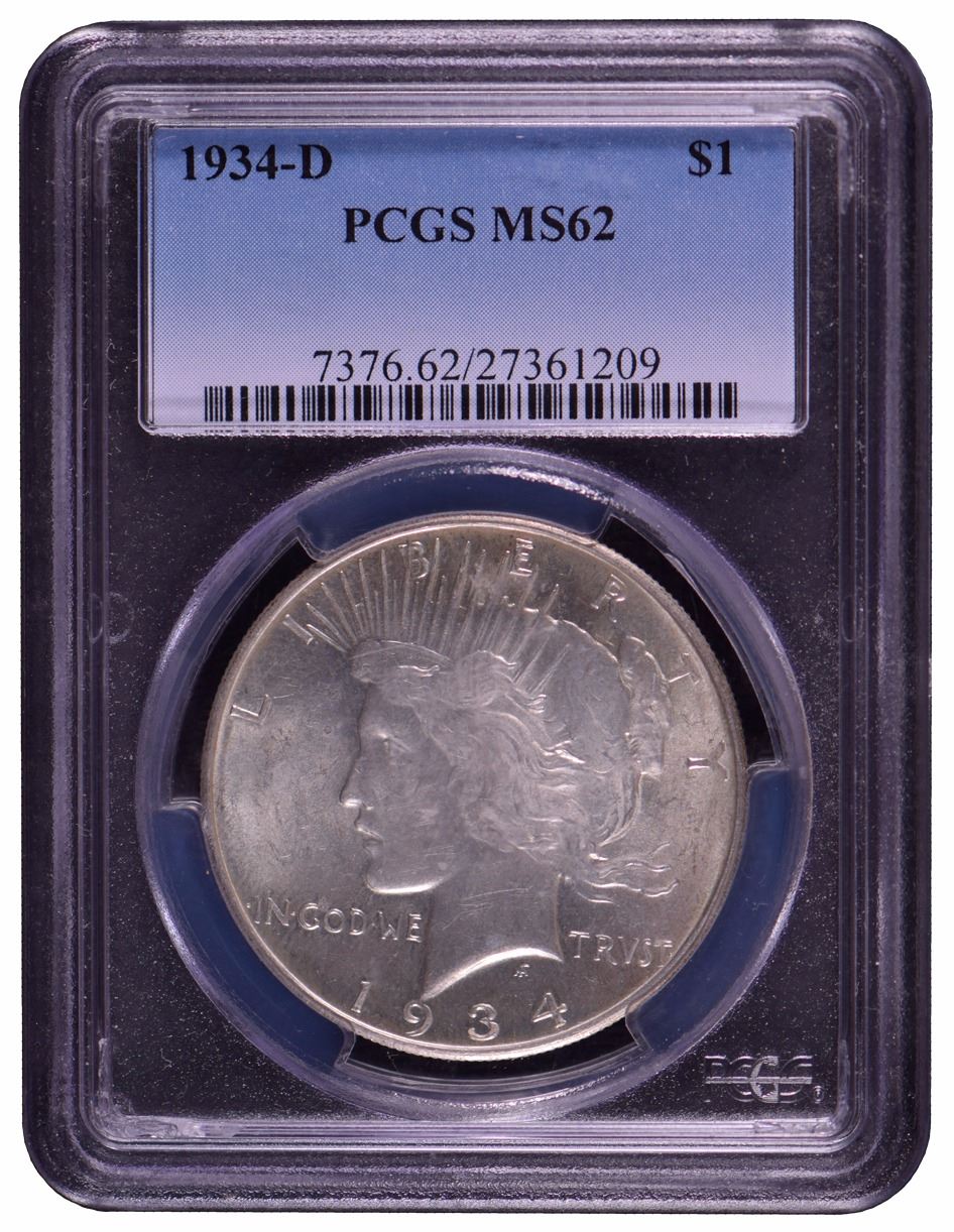 One 1934-D $1 Peace Silver Dollar Coin PCGS MS62.