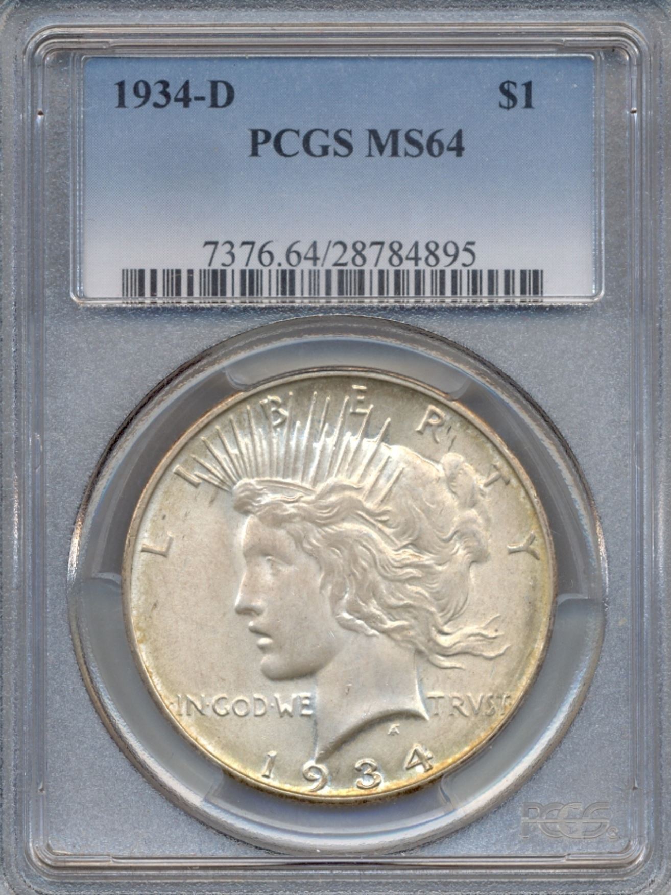 One 1934-D $1 Peace Silver Dollar Coin PCGS MS64.