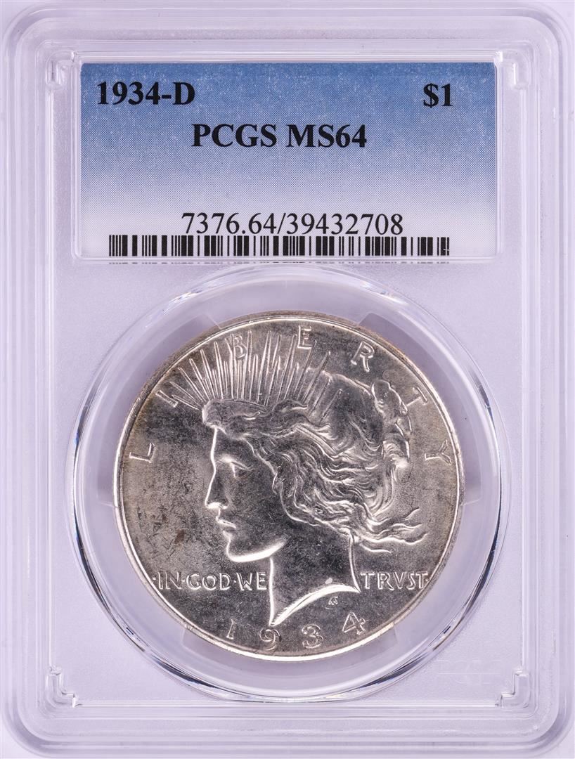 One 1934-D $1 Peace Silver Dollar Coin PCGS MS64. PCGS Graded.