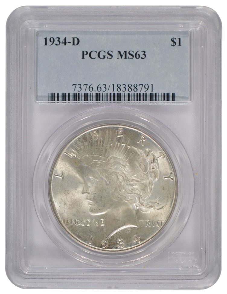 One 1934-D $1 Peace Silver Dollar Coin PGCS MS63.